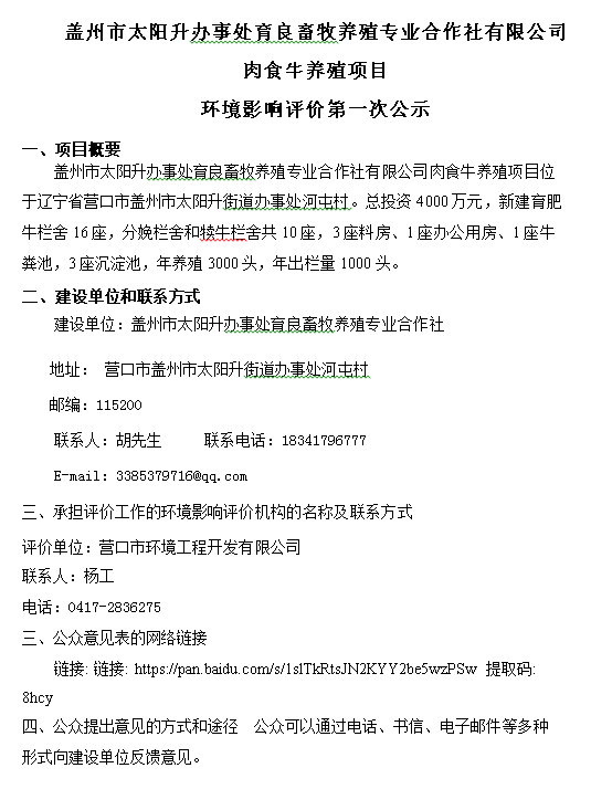 蓋州市太陽升辦事處育良畜牧養(yǎng)殖專業(yè)合作社有限公司 肉食牛養(yǎng)殖項目 環(huán)境影響評價第一次公示